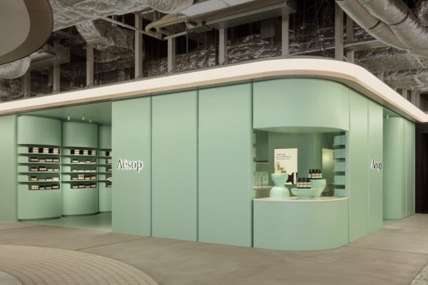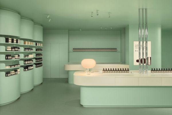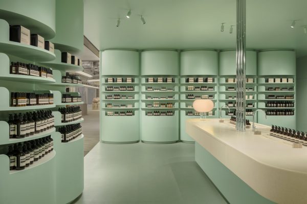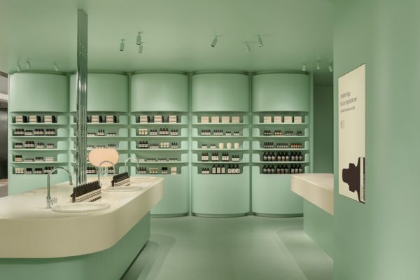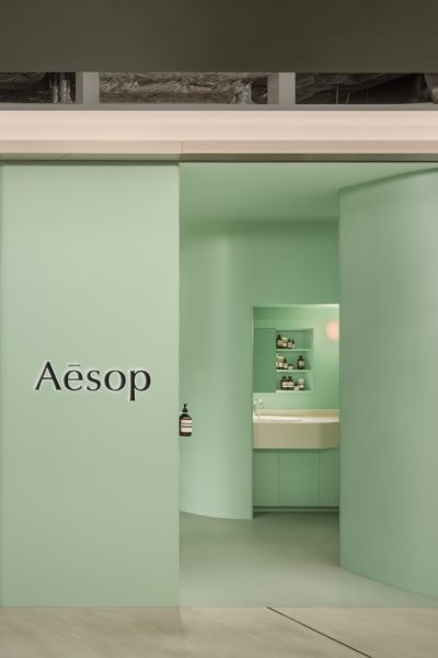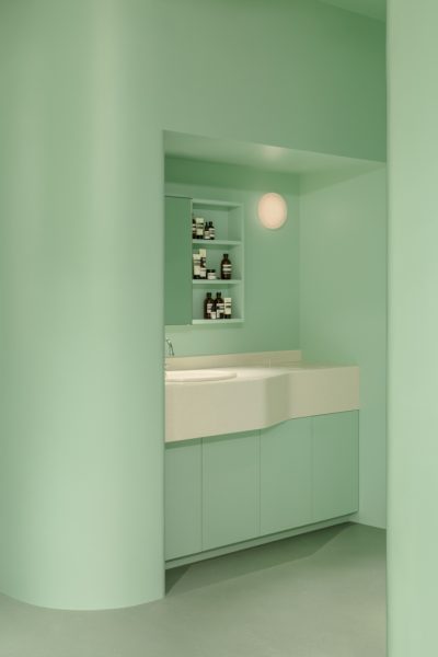 Aesop’s new store was designed within NEWoMan Takanawa, a commercial complex in Takanawa Gateway City. The corner site, measuring 10.8 meters wide and 7.6 meters deep, became the setting for the project.While exploring the surrounding area, what caught our attention was the Grand Prince Hotel New Takanawa, designed by architect Togo Murano. We were drawn to its organic curves and the refreshing harmony of materials, which inspired the direction of our design. The aesthetics of the Space Age in the 1960s—particularly the repeated capsule-like balconies—became a key reference, leading us to a composition where walls and fixtures merge into one continuous form, evoking the image of a ship or a space module.Along the façade, a soft green wall extends along the corridor, punctuated by a large corner display window that gently reveals the brand’s world to the outside. Inside, the floor, walls, ceiling, and fixtures are unified in the same green tone—a slightly sun-faded hue that recalls the vision of the future imagined in the 1950s and ’60s. By limiting the color palette, the outlines of each form stand out, allowing the products to appear in an orderly, almost floating manner. At the center stands a fixture combining an ivory basin with a solid surface countertop and stainless-steel fittings, evoking a sense of cleanliness and refinement. Toward the back, a corner equipped with a sofa and sink offers a calm environment for consultation.By layering the brand’s worldview with the unique context of this location, the space brings together a quiet dialogue between nostalgia and newness.