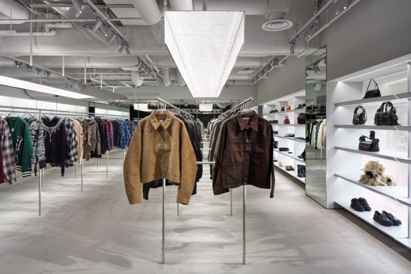 NUBIAN is a select shop that blends global fashion with street culture to create new trends. Following its locations in Harajuku, Shibuya PARCO, Nagoya PARCO, and Osaka, this project marks its first opening in Hokkaido and fourth city nationwide, for which we designed the interior at Sapporo PARCO. The site occupies approximately 265 sqm on the second floor, spanning both the main and annex buildings. At the front of the site, only a stockroom is intentionally placed. The black wall surface forms a gate, while a circular line of light traces the circulation, guiding visitors toward the main retail area in the back.The interior is finished in a palette of white and silver. Exposed piping and structural elements running across the ceiling retain a sense of raw street culture, while the addition of mirrored and acrylic surfaces layers reflections and transparency, giving the space a refined depth. Two long rows of hangers—symbolic of NUBIAN’s spatial identity—stand at the center of the store, above which a box of dot lighting is suspended to dramatically illuminate the products. Along the windows facing the façade, shelving backed with perforated metal is installed, allowing natural light to filter through its openings and gently diffuse throughout the space, bringing a sense of openness. Sound is treated as an integral spatial element. Speakers placed above and within the display counter, together with additional units located across the ceiling, create an immersive acoustic environment in which sound quietly melds with the space. Minimal in composition, yet layered with light, sound, and materiality, the space carries forward elements familiar to NUBIAN’s existing stores while seeking a new spatial expression unique to Sapporo.